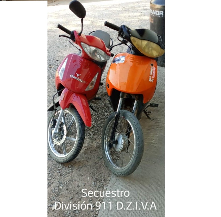En la jornada de hoy en horas de las siesta-tarde en el marco del Orden de la D.Z.I.V.A., personal de guardia proceden al secuestro de (01) Motocicleta Mondial,110 CC. color naranja y negro, conducida por C. J. W. de 22 años, y (01) Motocicleta Marca CORVEN ENERGY 110 CC, color Roja y blanca, conducida por D. Y., de 18 años.