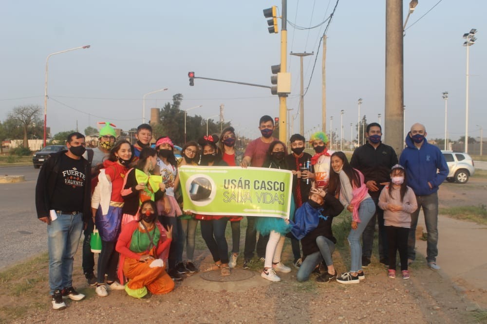 En la tarde del viernes los alumnos de la Tecnicatura Universitaria en Seguridad VIAL, de la UTN, Fabiana Maldonado, Sergio Vargas, Luis Córdoba y Carlos Suter, continuaron con tareas de concientización vial, conforme el proyecto de la Práctica Profesional Supervisada dictada por el Licenciado Gustavo Enciso. En la fecha se unieron a la concientización el Capellán Evangélico de la Dirección Zona Interior Villa Ángela Fabián Tkachuk, y jóvenes de la Iglesia Evangélica Congregacional quienes se vistieron de payasos, súper héroes, con el objetivo de llegar a los más chicos quienes a futuro corregirán a sus padres y ya aprenden sobre seguridad vial, fue una tarde fructífera ya que en medio de sonrisas y alegrías se repartieron folletos y la gente tuvo una aceptación muy buena, creándose cultura VIAL en el uso del casco a la ciudadanía.