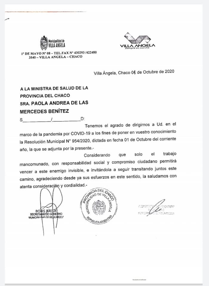 El intendente de la Municipalidad de Villa Ángela, ingeniero Adalberto Papp, solicitó al Ministerio de Salud la implementación del tratamiento de "ibuprofeno inhalatorio" para pacientes en recuperación de Covid-19. El pedido se oficializó a través de una nota y mediante la resolución n° 954/2020 adjunta.