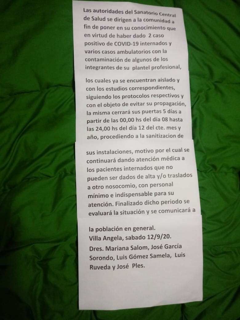 Villa Ángela: EL SANATORIO CENTRAL DE SALUD CIERRA SUS PUERTAS HASTA EL LUNES 12 DE OCTUBRE INCLUSIVE POR CASOS POSITIVOS DE COVID, PARA TRABAJOS SANITIZACIÓN