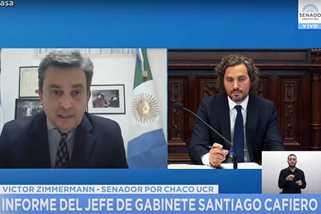 En el marco del informe ante el Senado del Jefe de Gabinete, Santiago Cafiero, el senador por el Chaco, Víctor Zimmermann, planteó cuestiones vinculadas con las comunicaciones en la provincia y la asistencia nacional por la sequía e incendios que afectan a los chaqueños.