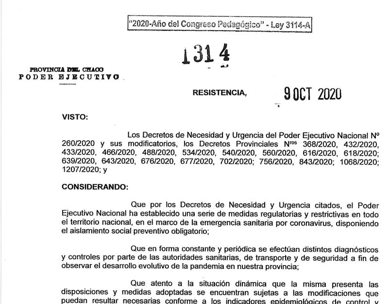 Entre los fundamentos se destaca que en los últimos días se ha observado un notorio incremento de casos positivos de Covid-19, especialmente en el área metropolitana del Gran Resistencia, por lo que se “hace necesaria la readecuación de medidas, determinando la vigencia de mayores restricciones para la circulación de bienes y personas como así también la reafirmación de un aislamiento social preventivo de carácter obligatorio, restringiendo en días y franjas horarias el desarrollo de actividades comerciales, industriales, de servicio, construcción, servicios profesionales, etc., a efectos de que la intervención territorial de las autoridades municipales y provinciales sanitarias y de seguridad, permita identificar los posibles focos de contagio e intervenir rápidamente en la contención de la propagación del virus SARS COV-2”.