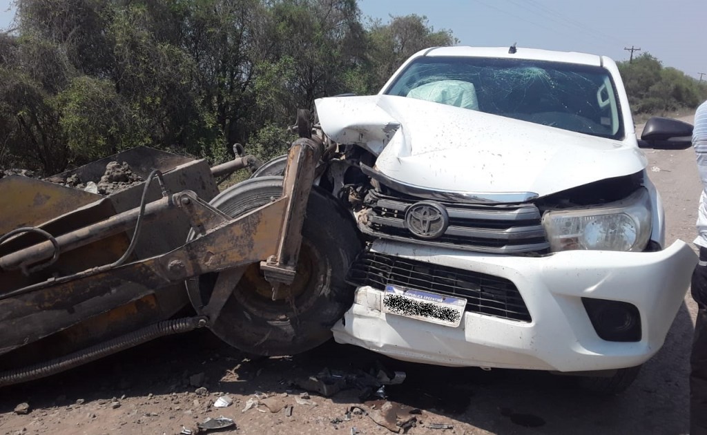 Constituida la prevención a lugar se entrevistó con O. V. de 60 años, el mismo conducía un tractor sin marca visible, sin dominio, color marrón, con enganche de pala en la parte trasera, la otra parte se trata de una camioneta marca TOYOTA, modelo HILUX, conducido por T. N. de 54 años, del Paraje “Las Manuelas” a unos 40 Km. quien presentaba una herida cortante entre ambas cejas aparentemente superficial.