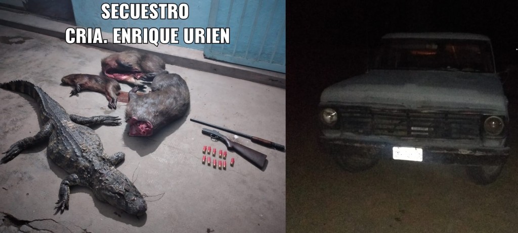 En la madrugada de hoy a las 3:30 hs. en el marco del operativo de prevención, el personal del control en el acceso a la localidad de Enrique Urien, intercepta el paso de un vehículo Ford F-100 color gris, conducida por N. G. J. de 45 años acompañado por C. L. O. de 40 años y F. D. A., de 36 años todos de la ciudad Villa Ángela, Quienes transportaban (01) yacaré mediano y (03) carpinchos uno grande y dos chicos muertos, (01) escopeta calibre 16 sin marca visible, con (11) cartuchos del mismo calibre sin percutir.