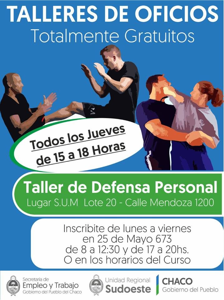 CHACO Gobierno del pueblo a través de la Secretaría de Empleo y Trabajo, en articulación con la Unidad Regional Sudoeste, informa a toda la comunidad que desde el jueves 18 de abril, se estará desarrollando el Taller de Oficio, Recreativo y Gratuito de Defensa Personal. El mismo tendrá lugar en el SUM Celeste del Lote 20, ubicado en calle Mendoza 1200.