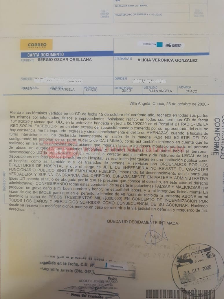 Que hace unos días tomé conocimiento por medio de las redes sociales, de que supuestamente existía una denuncia en mi contra por abuso de autoridad, persecución laboral y de amenazas por parte de un personal del hospital. En esa nota la abogada González, salió diciendo que yo había cometido el DELITO de amenazas y además me acusaba de persecución laboral y de haberle faltado el respeto a la personal. La verdad que todo esto me sorprendió, porque además de ser mentira, no me llegó nunca una notificación de la Fiscalía. Es por ello que decidí recurrir a mis abogados para interiorizarme de la situación. Ellos me informan que la Fiscalía dispuso que los hechos que habían denunciado NO CONFIGURAN DELITO.-