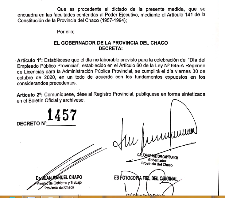 Ayer a la mañana, el gobierno provincial había decretado asueto administrativo para este próximo lunes 2 de noviembre. El Decreto 1448 del 26 de octubre, rubricado por el gobernador Jorge Capitanich y el ministro de Gobierno y Trabajo, Juan Manuel Chapo, declara asueto administrativo para el día lunes 2 de noviembre de 2020 para el personal de la administración pública provincial, docentes, organismos autárquicos y/o descentralizados con motivo de la recordación de los fieles difuntos. A su vez, se invita a los demás poderes, municipalidades, la industria y el comercio a adherirse a la medida dispuesta.