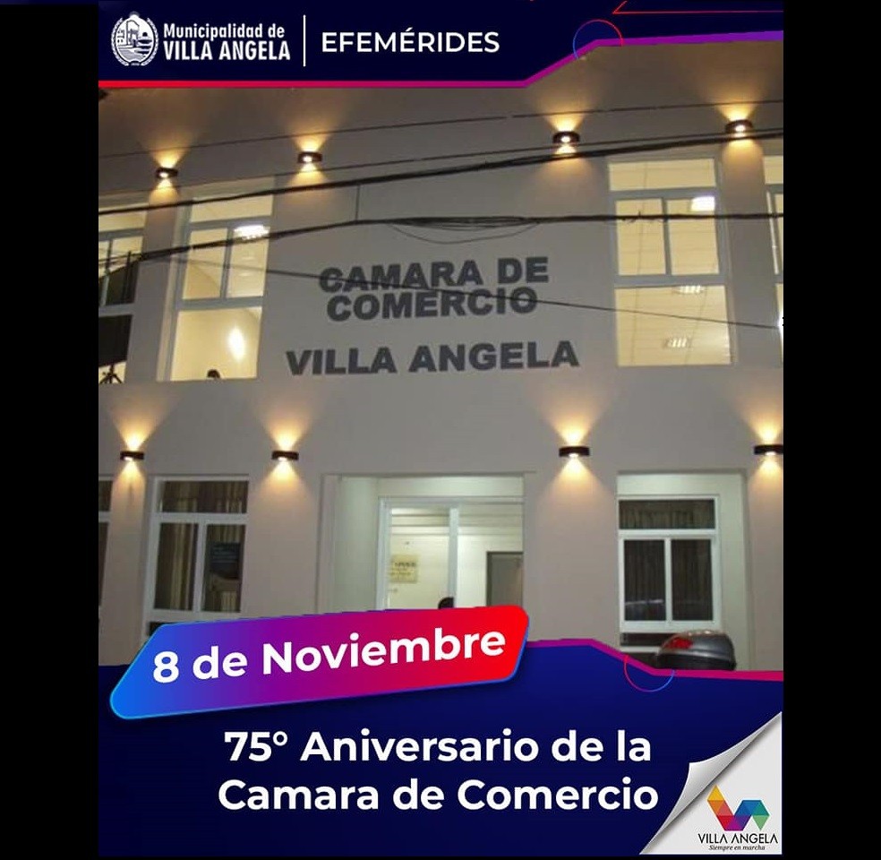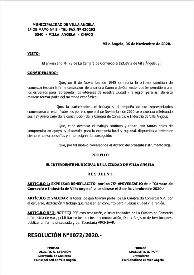 La Municipalidad de Villa Ángela, a cargo del intendente ing. Adalberto Papp, saluda a la Cámara de Comercio e Industria de la ciudad en su 75° aniversario.