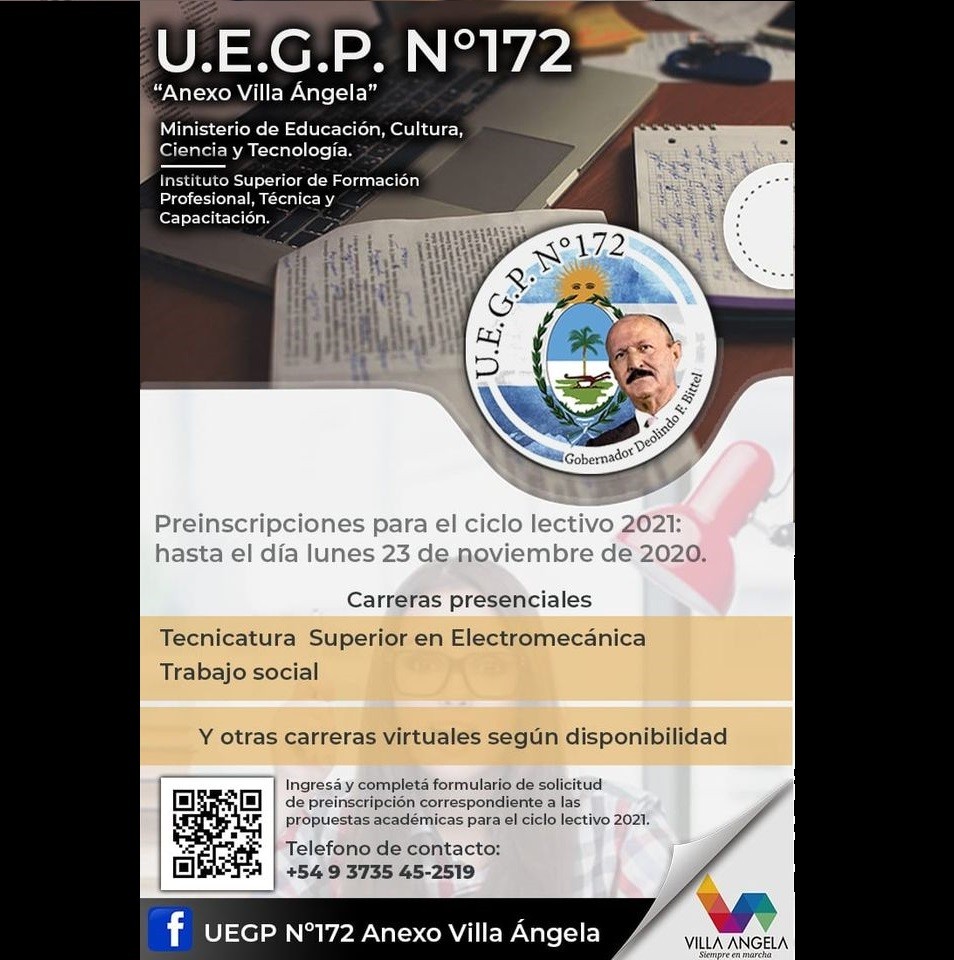 El Municipio informa que se encuentran abiertas las preinscripciones al ciclo lectivo 2021 para las carreras presenciales dictadas por la UEGP N° 172 "Gobernador Deolindo F. Bittel" anexo Villa Ángela y las propuestas académicas con formato de cursada virtual otorgado por la sede central de dicha institución, hasta el 23 de noviembre de 2020.