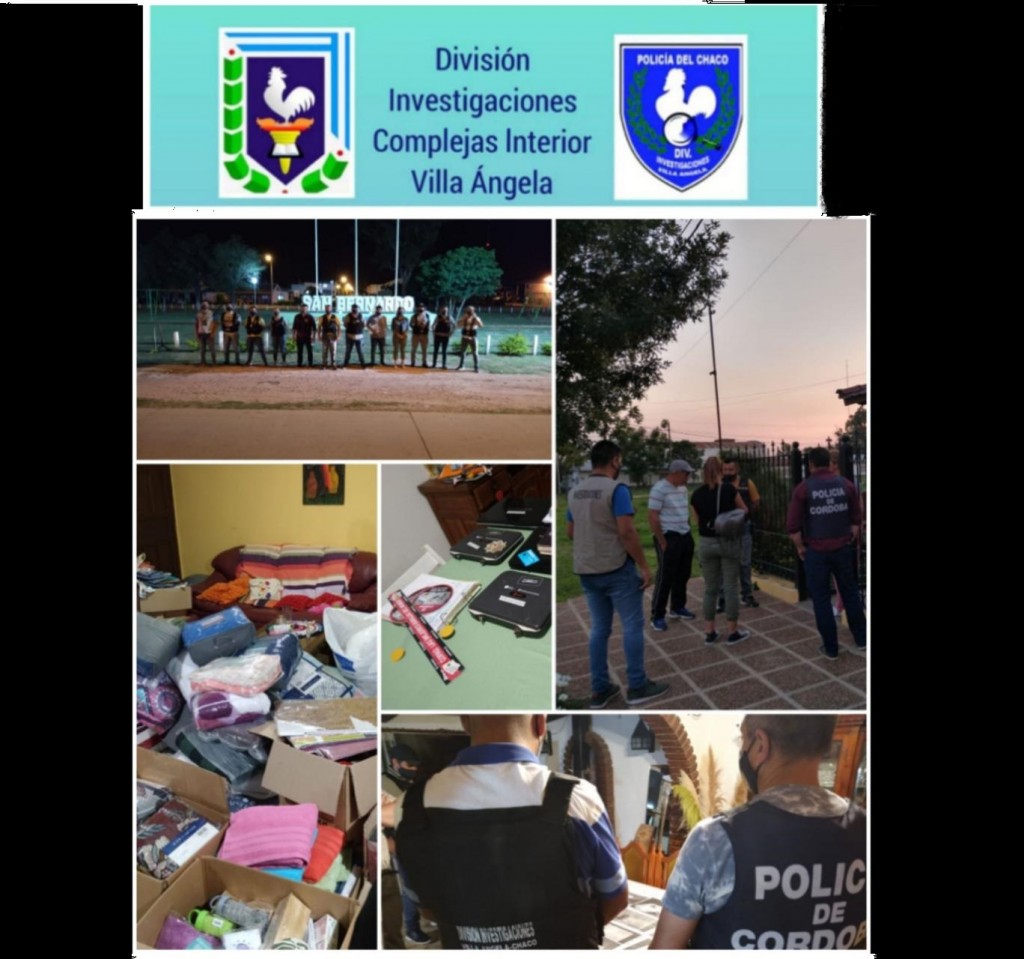 Respecto del domicilio en jurisdicción de la Dirección de Zona Interior Villa Ángela, de los ciudadanos G. C. y L. P. de la localidad de SAN BERNARDO, las diligencias de allanamiento solicitadas por exhorto desde la justicia de Córdoba y librada por la Juez de Garantías de Villa Ángela Dra. Yolanda Alvarenga de Gomes Samela, efectuadas por los Ayudantes Fiscales Marcela Gigena e Isaías Frías, afectándose a la totalidad del personal disponible de la División de Investigaciones Complejas Interior Villa Ángela, trabajando en conjunto con personal de la Unidad de Causas Complejas de la Policía de Córdoba, arrojaron RESULTADO POSITIVO: