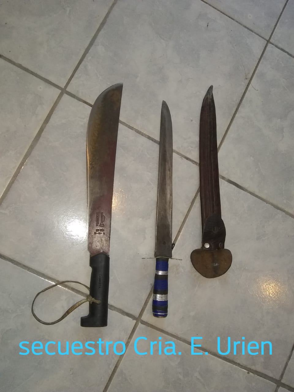 Se procedi� al formal secuestro de (01) cuchillo tipo carnicero 30 cm. de hoja Marca "corneta", con vaina de cuero y (01) cuchillo tipo pu�al 30 cm. de hoja con empu�adura plastica color azul.