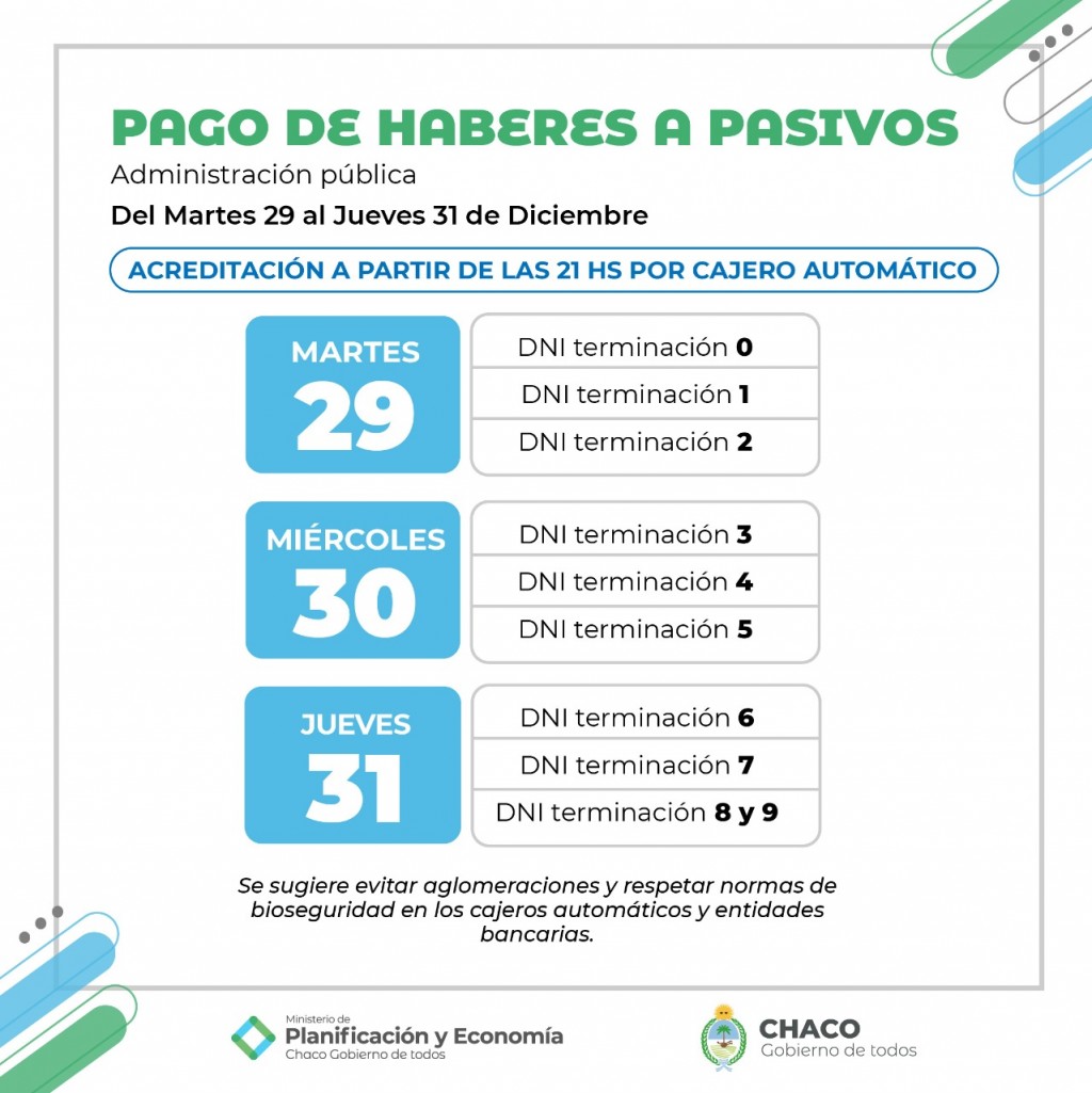 Para los pasivos, el inicio de pago de haberes comenzará este martes 29 de diciembre para las personas con DNI finalizados en 0, 1 y 2; el miércoles 30, para aquellos con DNI finalizados en 3, 4 y 5 y finaliza el jueves 31 con la acreditación de sus respectivos haberes para aquellos con DNI finalizados en 6, 7, 8 y 9.