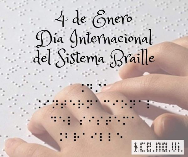 Descripción de la imagen: en el fondo unas manos leyendo un libro en Braille, un texto que dice 4 de Enero día internacional del Sistema Braille y también se encuentra escrito en Braille. Abajo el logo de CENOVI.