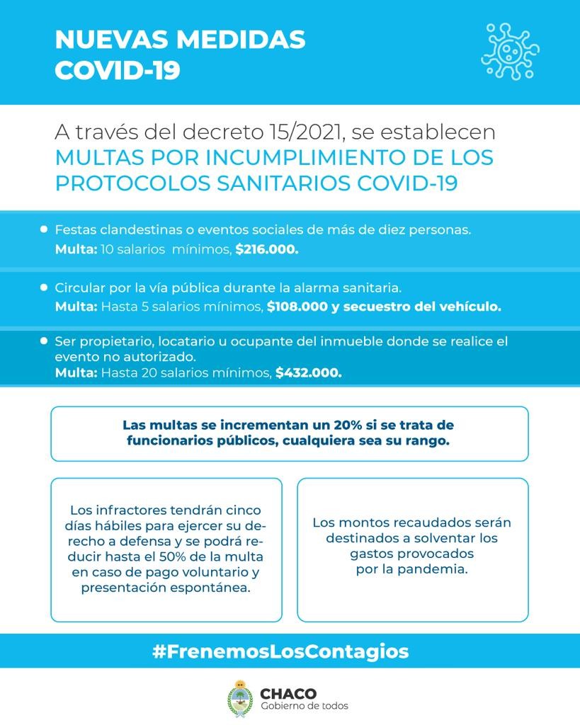 Ante la proximidad del fin de semana, el gobierno provincial recuerda la vigencia del decreto N° 15/2021, que establece un régimen de sanciones por incumplimiento a las medidas sanitarias establecidas ante la pandemia por Covid-19. Las multas, que van desde 108.000 pesos a 432.000 pesos, tendrán aplicación efectiva a través del Ministerio de Seguridad y Justicia y la Policía del Chaco.