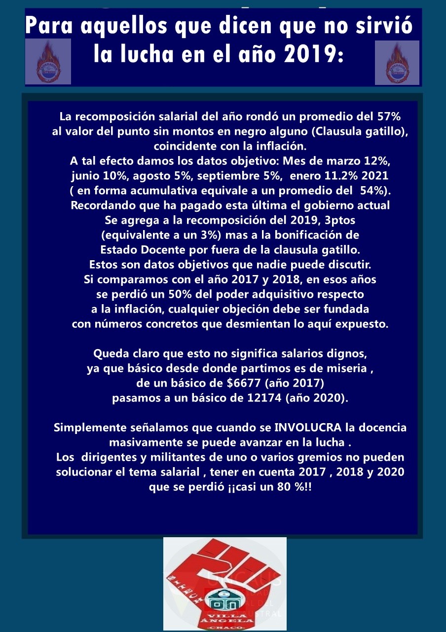 En ese sentido, Saucedo explicó que algunos rumores tenían que ver con lo sucedido en el 2019 donde hubo una lucha intensa, se lograron 11 puntos que garantizaban la implementación de la cláusula gatillo, entre otras cosas. "Era una demanda muy fuerte de la docencia en general. Ese año no pudimos sostener nuestro salario gracias a la cláusula gatillo que fue lo que terminamos de cobrar entre enero y febrero del 2020. El gobernador Capitanich se comprometió darle continuidad a la cláusula gatillo, pero después de la pandemia sólo recibimos el 7,8 % que quedó muy por debajo de toda la inflación" dijo Saucedo.