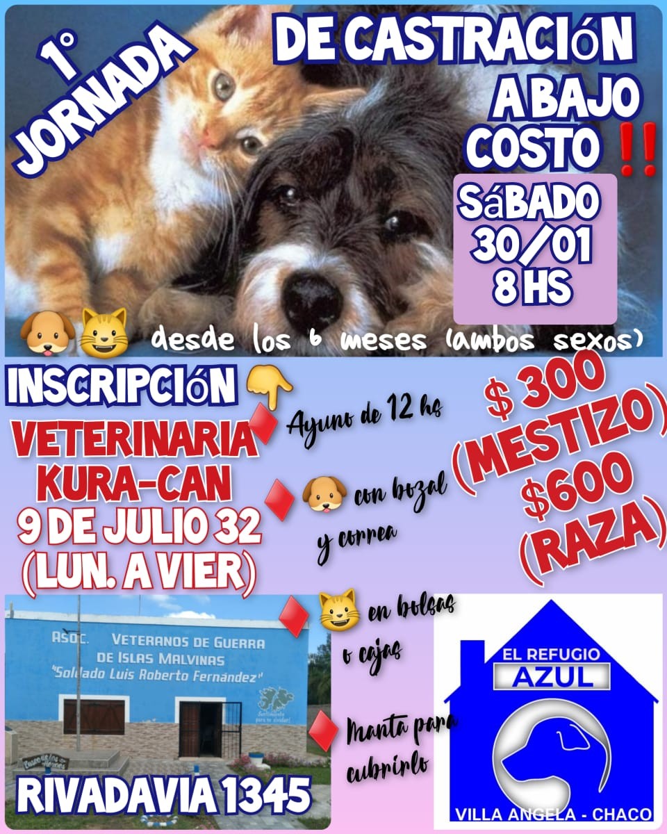 La jornada de castración a bajo costo se realizará en Rivadavia 1345, que es la Asociación de Veteranos de Guerra de Islas Malvinas "Soldado Lui Fernández", este sábado 30 a partir de las 08:00 con inscripción previa en la veterinaria del doctor Alejandro Jaquemin. Se realiza con un cupo de alrededor de 60 animales".