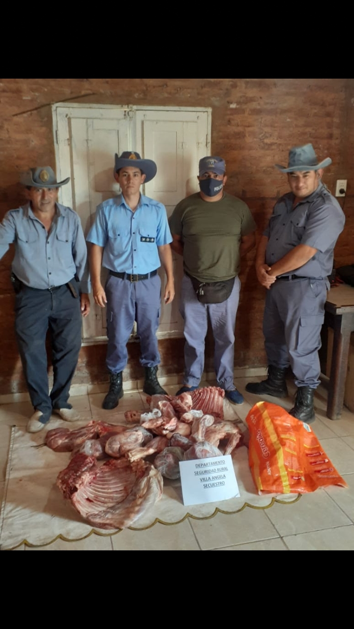 En donde tras minuciosa búsqueda el personal de la policía logra hallar en una pieza tipo lavadero dentro de un fuenton (02) costillar (01) paleta (01) cuarto y dentro del frezer de una heladera se encontraron (02) canillas y (08) bolsitas con carne, todos productos carne de animal vacuno.