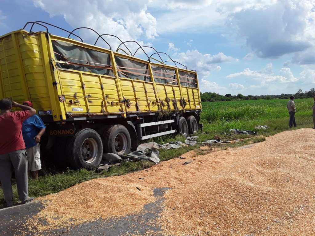 Al llegar al lugar, constataron que se trataba de un camión Ford 1730, blanco, el cual tenía el acoplado volcado sobre la mitad de la calzada y pérdida de granos de maíz.