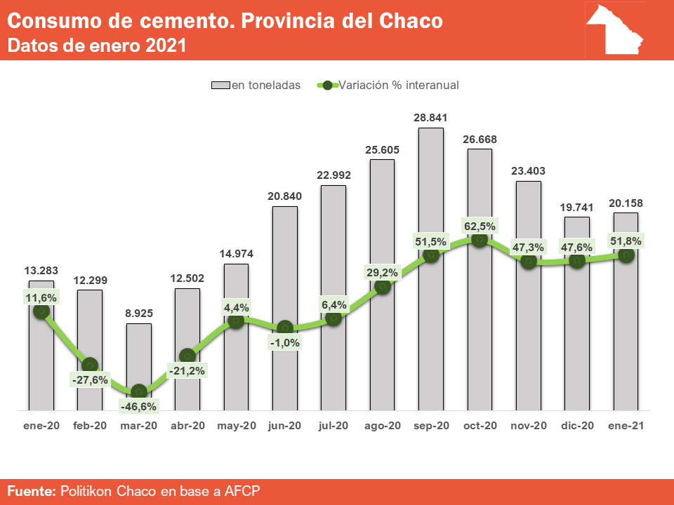 El consumo de cemento en la provincia del Chaco durante el mes de enero 2021 fue por un total de 20.158 toneladas, y trajo dos buenas noticias: en primer lugar, hay un aumento del 51,8% respecto a enero 2020, y así, Chaco acumula siete meses consecutivos de alzas interanuales; en segundo lugar, también tuvo un aumento en términos mensuales, ya que el volumen anteriormente detallado es un 2,1% mayor al de diciembre 2020, y de esa forma el Chaco volvió a crecer en términos mensuales luego de tres períodos de retracción.