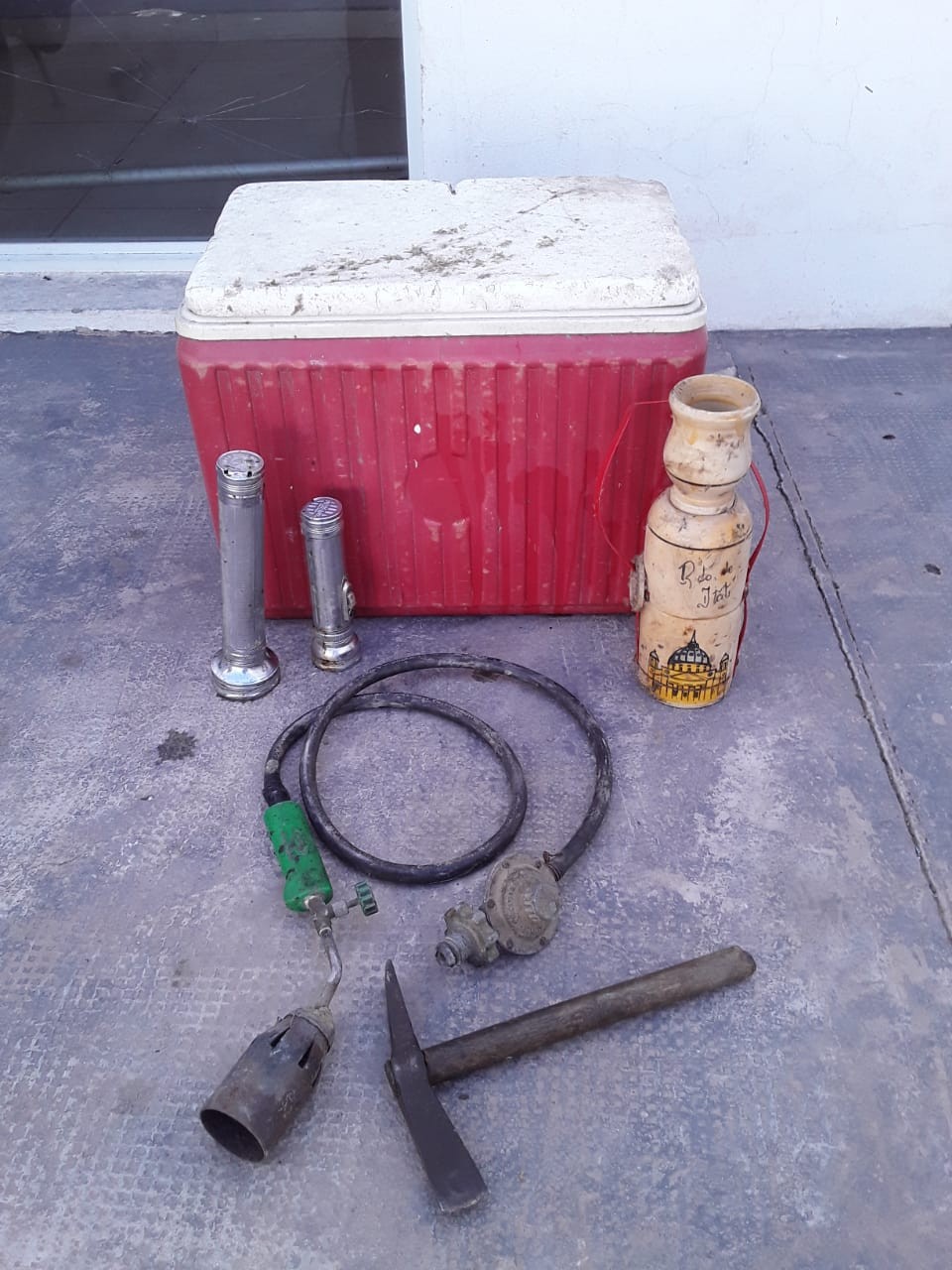 Éste tendría en su poder una conservadora sin marca visible, de color rojo; un soplete; un pico chico, con cabo de madera, dos linternas de marca Lucky Star, de diferentes tamaños y un juego de mate de madera.