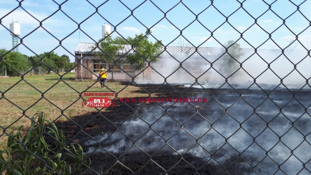 Partió al lugar una dotación en Autobomba A-4 donde una vez allí se constató un incendio sobre pastizal en predio de la Escuela Primaria N° 1057, el personal concurrente procedió a la extinción del proceso combustivo mediante arrojo de agua con mochilas hidrantes y utilización de hisopos.