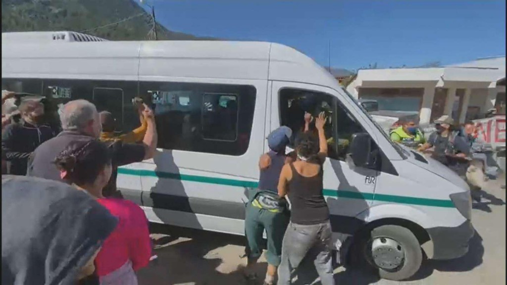 Al finalizar la reunión, un grupo de manifestantes increpó a la comitiva y comenzó a arrojar piedras y a golpear a la camioneta. Al parecer, reclamaban al gobernador Mariano Arcioni y al presidente por la actividad minera en la provincia, puntualmente por un proyecto que el mandatario provincial apunta a ampliar pero que los pobladores rechazan debido a las consecuencias ambientales.