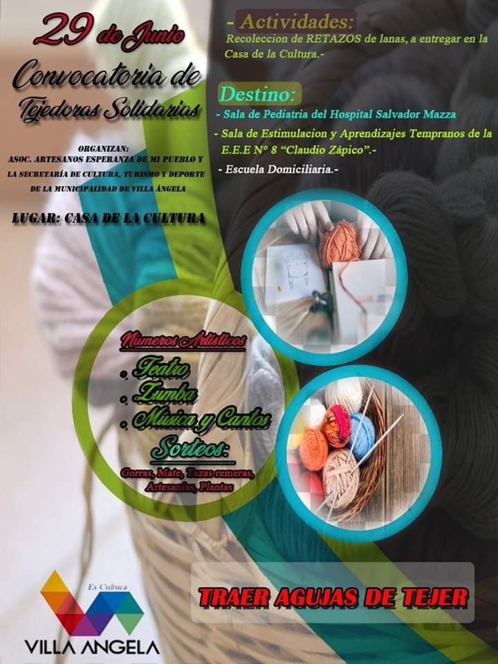Este día Sábado 29 de Junio se llevará a cabo la convocatoria de tejedoras solidarias, a partir de las 14 hs, en el espacio del Instituto de Cultura en San Martin y Pasteur de nuestra ciudad de Villa Ángela.