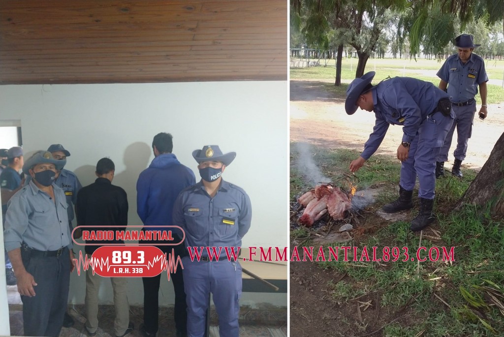 En el día de la fecha horas 08:30, salió la comisión policial hacia la localidad de Santa Sylvina, y luego de realizar arduas tareas investigativas llevadas a cabo por el personal del Departamento de Seguridad Rural Villa Ángela, personal de la Sección Rural Venados Grandes y Comisaria jurisdiccional, se logró establecer que los partícipes serian tres sujetos llamados D. F., M., y M., procediéndose a la APREHENSIÓN de dos de los involucrados en la casusa antes mencionada, siendo identificados como G. A. M., de 32 años, del B° San Roque, y M. A. M., de 21 años, domiciliado en Calle Eva Perón, ambos de Santa Sylvina, el SECUESTRO de 20 kgrs de producto carneo de la especie YACARÉ y (01) posarril, modificado a chuza, elemento que fue utilizado para cometer el presente hecho ilícito.