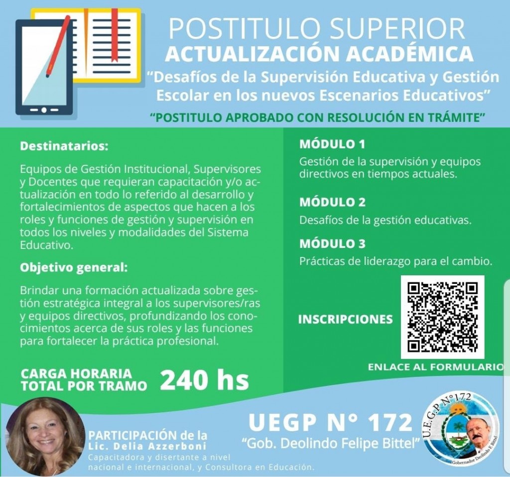 La UEGP N° 172 "Gobernador Deolindo F. Bittel" en convenio con el Municipio de Villa Ángela, ofrece un Postítulo Superior que refiere a la Actualización Educativa. La diplomatura está dirigida a todos los docentes interinos o titulares en el cargo, con un mínimo de 2 años de antiguedad, en especial a los que llevan adelante la gestión educativa, como directores o supervisores de instituciones. A su vez, resaltaron que la fecha de inscripción se extendió hasta el 16 de abril.