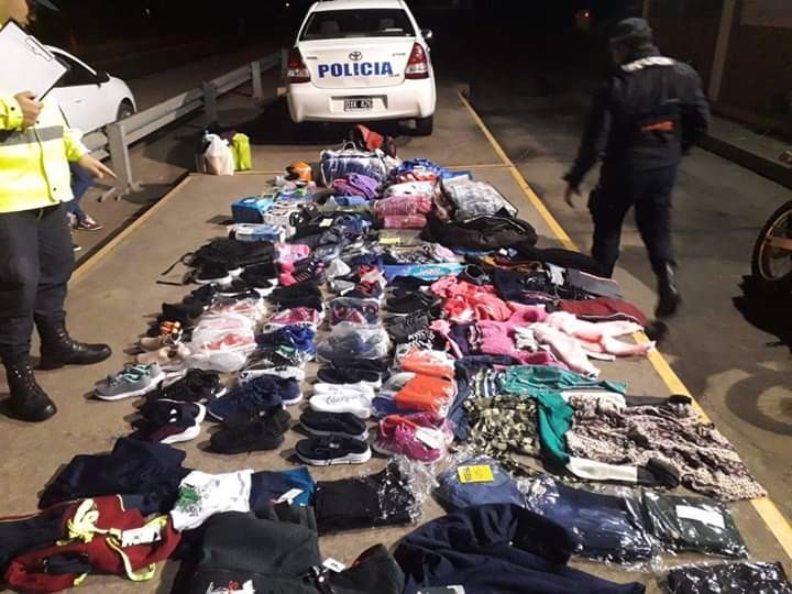 En la tarde del S�bado, alrededor de la hora 18 aproximadamente, el personal de la Divisi�n Patrulla Vial y Puestos Camineros que realizan sus labores de control vehicular y de documentaciones en Puesto Caminero Paralelo 28, ubicado en Ruta Nacional 11 kil�metro 931, demoran el paso de un autom�vil Renault Logan, color blanco, con tres ocupantes mujeres de 28 a 30 a�os, quienes viajaban desde Paraguay con destino provincia de Santa Fe, transportando gran cantidad de bultos dentro del habit�culo del veh�culo por lo cual, los uniformados solicitan les exhiba los mismos trat�ndose de 38 pares de zapatillas, indumentarias, juegos de sabanas, frazadas y electrodom�sticos varios.