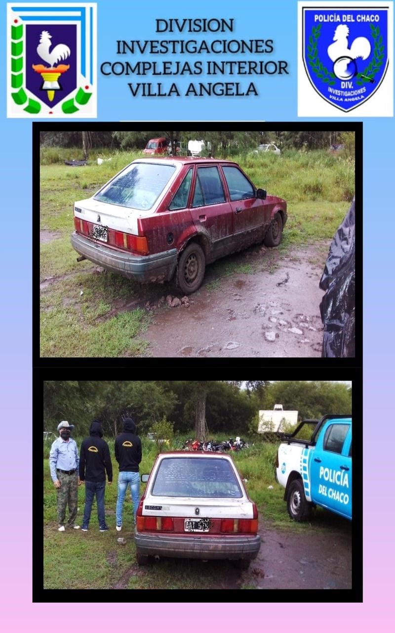 Se solicito la colaboración del Departamento de Seguridad Rural de Villa Ángela, en donde en fecha 15 de abril a las 23:30 hs., el personal del citado Departamento, en circunstancias de hallarse realizando tareas especificas en zona rural a Los Gansos, avista el desplazamiento de un vehículo con chapa patente colocada con letras y numeración a las enuncidas por los testigos de la causa, siendo el mismo de marca FORD, modelo ESCORT, color bordo y parte trasera gris y tras el operativo se logra la interceptación, Secuestro y conducción de su poseedor N. D., de 31 años, domiciliado en España y Fuerte Esperanza.