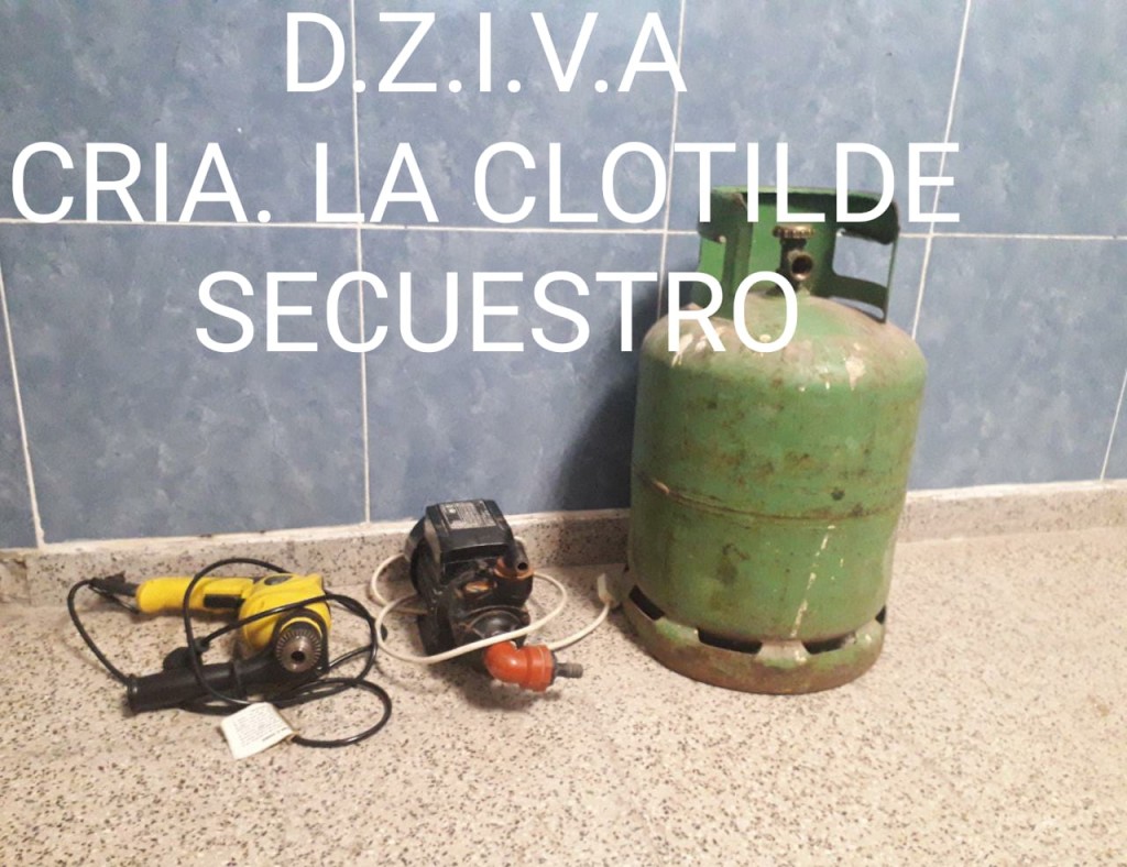 En la tarde de hoy C. J. A. de 76 años, del B° 100 viviendas de la localidad de La Clotilde, denunció que hace dos meses constató la faltante de una garrafa de 10 kg. de color verde, una bomba centrífuga de ½ hp. de color negro y que, en fecha 23 de abril su familiar, menor de edad que reside en el mismo domicilio le sustrajo un taladro marca WORK color amarillo y negro.