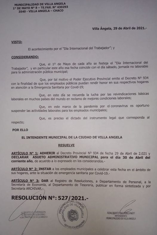 Por resolución municipal n°527/2021 la Municipalidad de Villa Ángela adhirió al decreto provincial n°934 que declara asueto administrativo para el día viernes 30 de abril de 2021