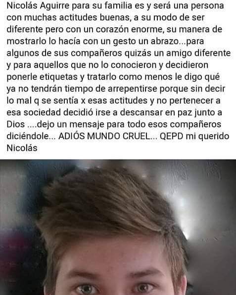 "Adios mundo cruel”. A través de una carta, El pibe se despidió de sus padres . Nicolas Aguirre de 15 años iba colegio secundario de la Tigra, y según la publicación de su madre, dice que sufría bullying o acoso departe de algunos de sus compañeros. Fuente: Diario Digital Sudoeste