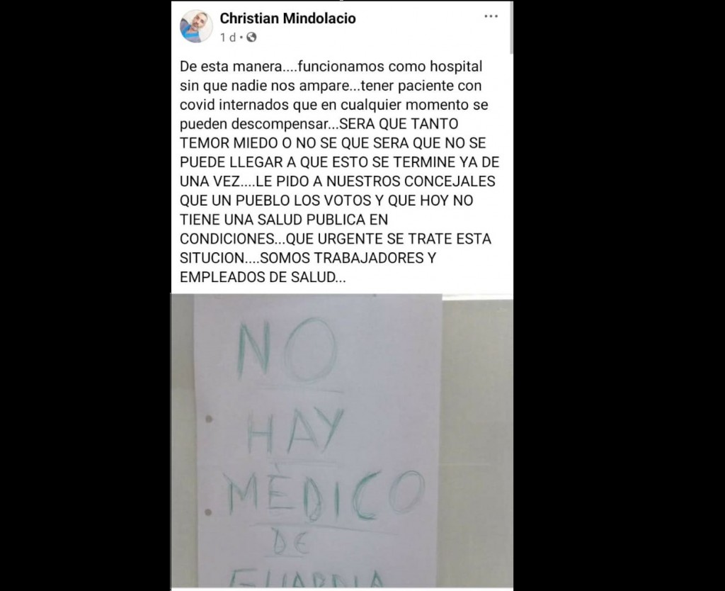 Además, recordó que hubo un accidente pero que aún no había cronograma de guardias. "Como delegados de UPCP el año pasado habíamos presentado notas a nuestro director, a la parte de salud pública y a nuestro intendente por la falta de recurso humano, falta de insumos, falta de ambulancias, porque sabíamos que esta pandemia iba a durar mucho tiempo, pero nunca tuvimos una respuesta a esas notas y hoy todo lo que habíamos volcado en esa nota, está repercutiendo en el hospital" expresó Mindolacio y mencionó que tuvieron que tratar una paciente embarazada en la guardia, no tenían la medicación adecuada, el broche para el ombligo del bebé y "el médico que estaba de guardia salió a comprar a la farmacia de guardia en la localidad para poder atender a esta paciente".