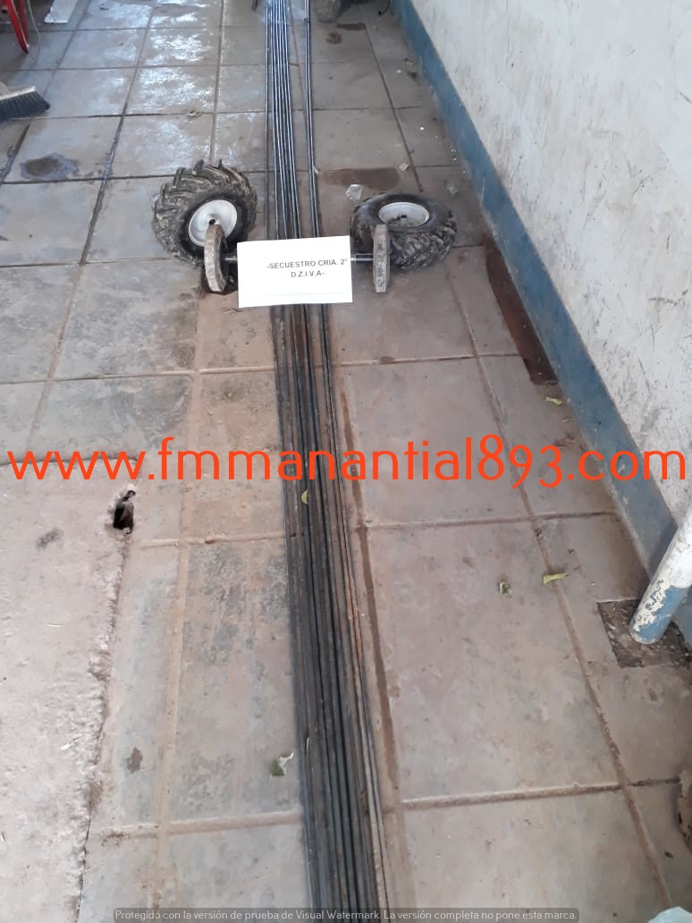 El personal del servicio externo abocado a las tareas investigativas estableció que el autor seria N. G. C., mayor de edad, y que los elementos sustraídos se encontrarían en calle Soldado Drasich,el personal se constituyó en el lugar y los recibe O. A. de 51 años, quien al tomar conocimiento hizo entrega voluntaria de dos ruedas de un Rotocultor, rodado 10, con llantas color blancas, ocho barras de hierro de 12 pulgadas.