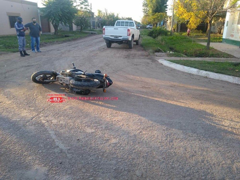 El hecho ocurrió esta tarde a las 17:25 horas, en la esquina de calle Ameghino y España, el cual tuvo como partícipes, a una camioneta TOYOTA HILUX, cabina simple Dominio  OIP758 guiada por CH.  F. de 52 años quien resultó ileso, y una  Motocicleta YAMAHA FZ 150 cc. color negra, dominio  998-HPT, guiada por  M. C. de 16 años, quien resultó con lesiones, siendo trasladado en ambulancia, al Hospital "Dr. Salvador Mazza" de nuestra ciudad.