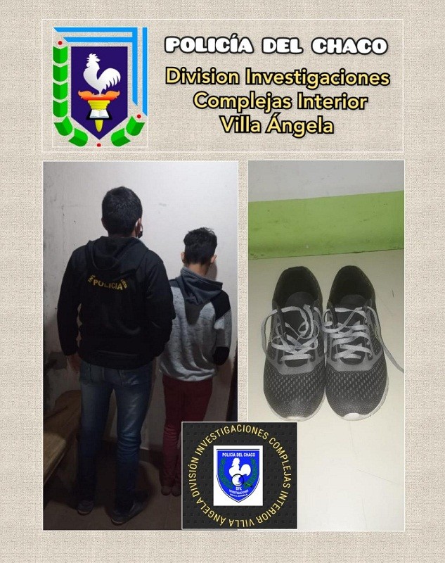 Hoy en horas de la tarde, a las 17:00 horas, el Personal de la División de Investigaciones Complejas Interior Villa Ángela, mientras realizaba sus tareas en el sector del Barrio Sur de nuestra ciudad, fue alertado por un vecino quien se identificó como E.S.R.D. de 30 años domiciliado en Mz. 2 Pc. 8 del Barrio 75 Viviendas. El cual les indicó que “momentos antes sufrió la sustracción de un par zapatillas, marca ‘G’, color negra con plantilla blanca seminueva, acordonada, Nº 42”.