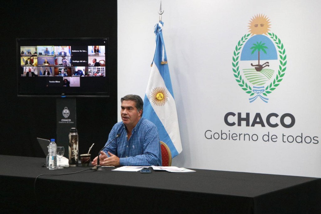 El gobernador Jorge Capitanich participó este miércoles por la tarde de una videoconferencia junto con el presidente de la Nación, Alberto Fernández, la ministra de Salud de la Nación, Carla Vizzotti, el ministro del Interior, Eduardo de Pedro y otros 12 gobernadores, para analizar la situación epidemiológica del país, por el aumento de contagios en la segunda ola por Covid-19, y definir así medidas en conjunto.