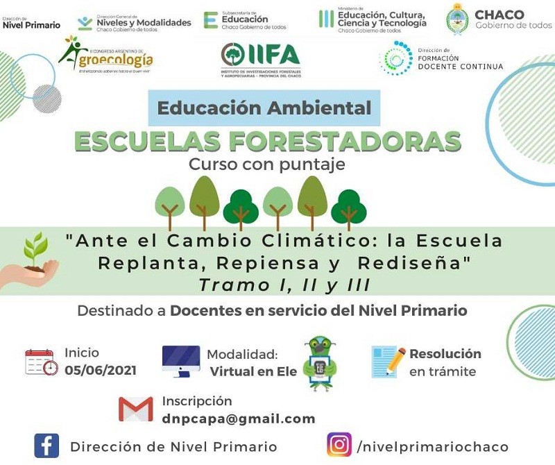 Se realizará el sábado 5 de junio el curso "Ante el cambio climático: la escuela replanta, repiensa y rediseña" Tramo I, II, y III, destinado a docentes en servicio del Nivel Primario. Se trata de un curso con puntaje sobre educación ambiental hacia una visión de escuelas forestadas.