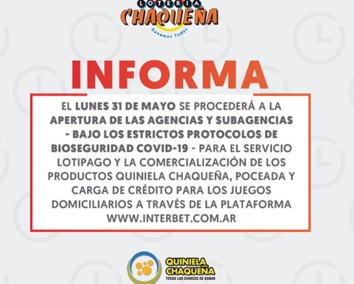 A través de su página web, Lotería Chaqueña anunció que este lunes 31 de mayo se procede a la apertura de agencias y subagencias.