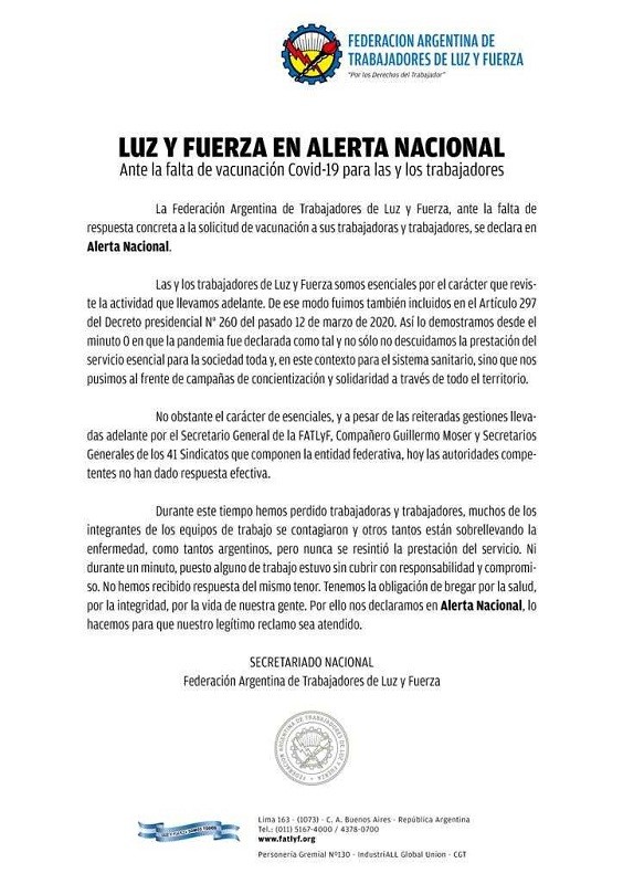 Ante todo, con el objetivo de “bregar por la saludad, por la integridad, por la vida de los operarios”, la Fatlyf declaró el estado de Alerta Nacional por la falta de vacunación para sus operarios, pese a ser operarios “esenciales” de un “servicio esencial”.