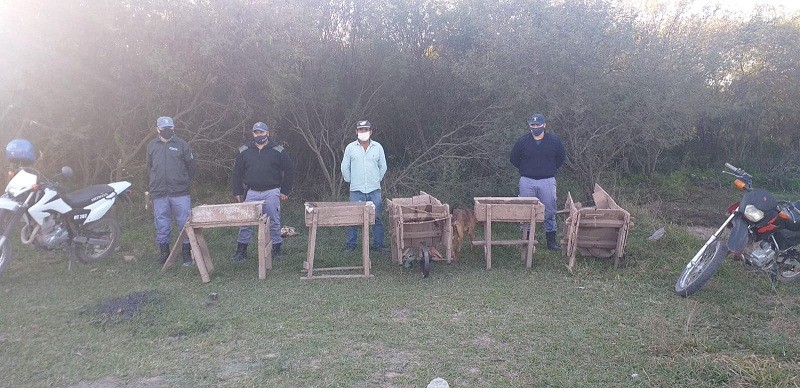 En muy pocas horas y tras tareas investigativas, la policía logró hallar en una zona boscosa las dos carretillas y tres mesas de maderas para corte de adobe, denunciadas como sustraídas.