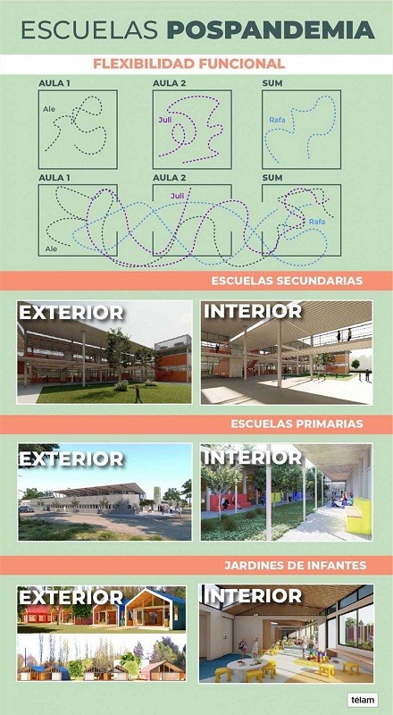 Aulas flexibles en tamaño y forma que se adecuan a las exigencias sanitarias y educativas del futuro, acondicionamiento del aire para evitar la circulación de virus, utilización de energías renovables, construcción ecológica e instalaciones abiertas al uso comunitario, son algunas de las características de la nueva escuela que el gobierno de Santa Fe construirá para tiempos de pospandemia. La secretaria de Obras Públicas de Santa Fe, Leticia Battaglia, dijo a Télam que "con este modelo edilicio nos estamos adelantando en el tiempo", y aseguró que "es la escuela del futuro, hoy". "Es un edificio arquitectónico que responde a los desafíos espaciales y sanitarios que plantea la pandemia, y es un modelo que podrá replicarse adaptándolo a cada terreno y a cada comunidad", señaló.