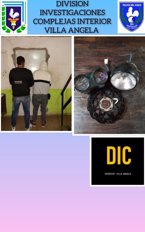La Policía alertada de la presencia del menor G.L.CH alias “Cara de Vieja” de 15 años, en inmediaciones del Barrio “Sargento Cabral” de Villa Ángela, ofertando a la venta motopartes, acudió al lugar y en la intersección de las Avenidas W. Espinoza y La Plata, lograron interceptar al menor. El cual tenía en su poder (1) Velocímetro, (1) Faro Delantero y (1) Disco de Freno color negro todos correspondientes a marca HONDA, mod. CG TITAN, coincidente con la motocicleta denunciada como sustraída.