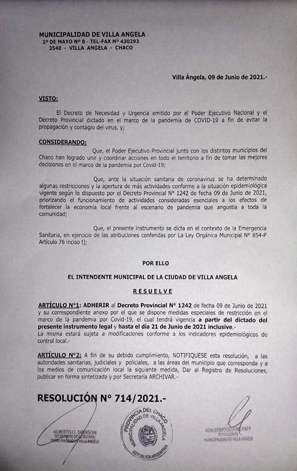 La Municipalidad de Villa Ángela, a través de la Resolución N° 714/2021 adhiere al Decreto Provincial N° 1242 disponiendo medidas especiales de restricción en el marco de la pandemia por Covid 19 desde el 9 hasta el 21 de junio de 2021, inclusive.