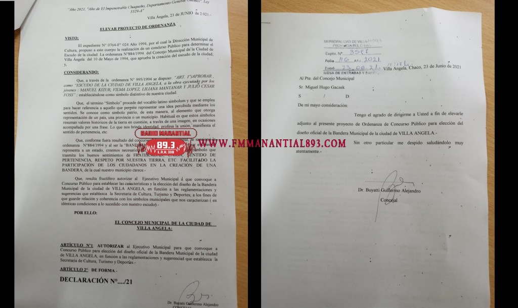 Al respecto indicó a #RadioManantial89.3 que “…he presentado un proyecto de ordenanza, de autorizar al ejecutivo que convoque a un concurso abierto que establezca obviamente las reglamentaciones del concurso, mediante la subsecretaría de cultura del municipio, así como se hizo oportunamente respecto de nuestro escudo, que fue un proceso en su momento, que Villa Ángela tiene su propio escudo. Y creemos que es pertinente que nosotros también tengamos una bandera que son los símbolos, nuestros símbolos patrios, son los símbolos que nos identifican y nos representan…”.