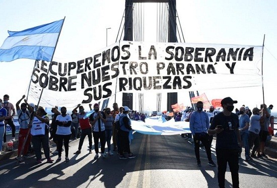Bajo la consigna “Por la soberanía y el control sobre nuestro Río Paraná y las riquezas que por allí circulan”, centenares de personas de distintas fuerzas políticas, sociales, sindicales y estudiantiles – de Chaco y Corrientes – marcharon para manifestar su apoyo a las medidas tomadas por el Gobierno nacional que, mediante el decreto 427/21, establece por un plazo de 12 meses la operatividad de la llamada Hidrovía Paraná- Paraguay por parte de la Administración General de Puertos, para brindar una mayor presencia y control estatal, y por la derogación del decreto 949/20, que autoriza el llamado a licitación pública nacional e internacional para adjudicar la concesión de las obras a empresas extranjeras.
